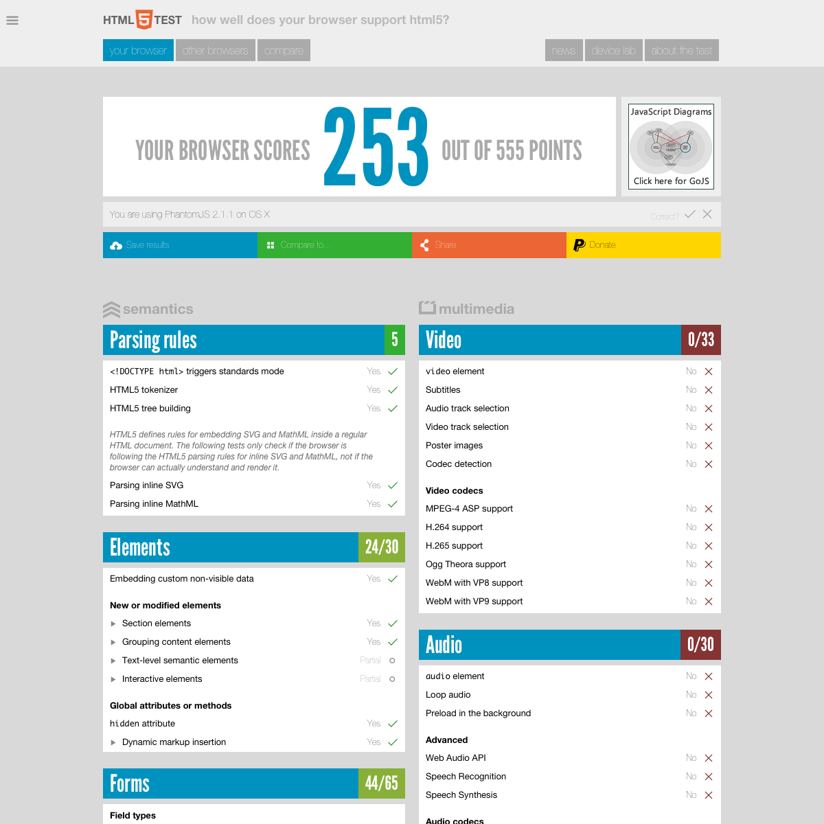 We use HTML5Test to test our browser configuration. HTML5Test gives a great overview of what features are supported by a given browser. Some things to look for when evaluating a render solution are: