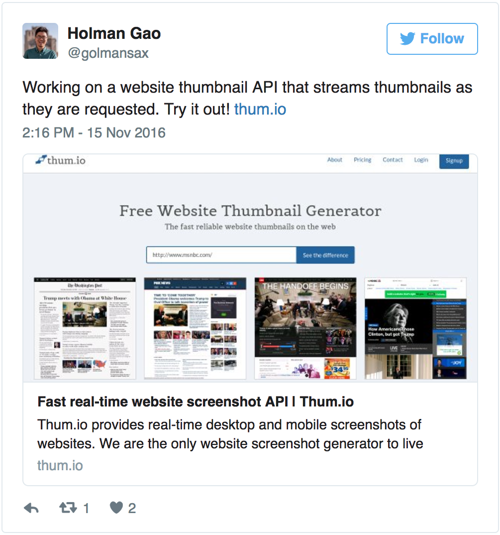 That’s all the code it takes to get set up! Get started with Thum.io for free to start generating your screenshot share images.